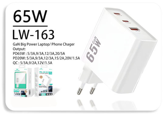 LEEWELLO LW-163 επιτοίχιος φορτιστής GAN Super Fast Charger 65W με 2 X Type-C και 1 x USB-A – λευκός
