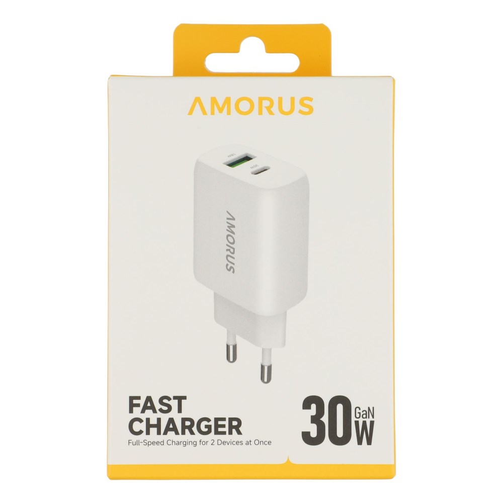 Ταχυφορτιστής Τοίχου AMORUS – GaN 30W – USB-C & USB-A – Dual Port – EU Plug