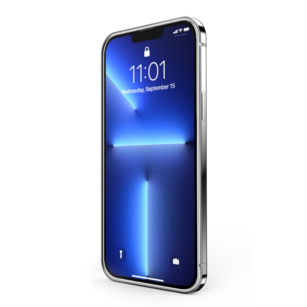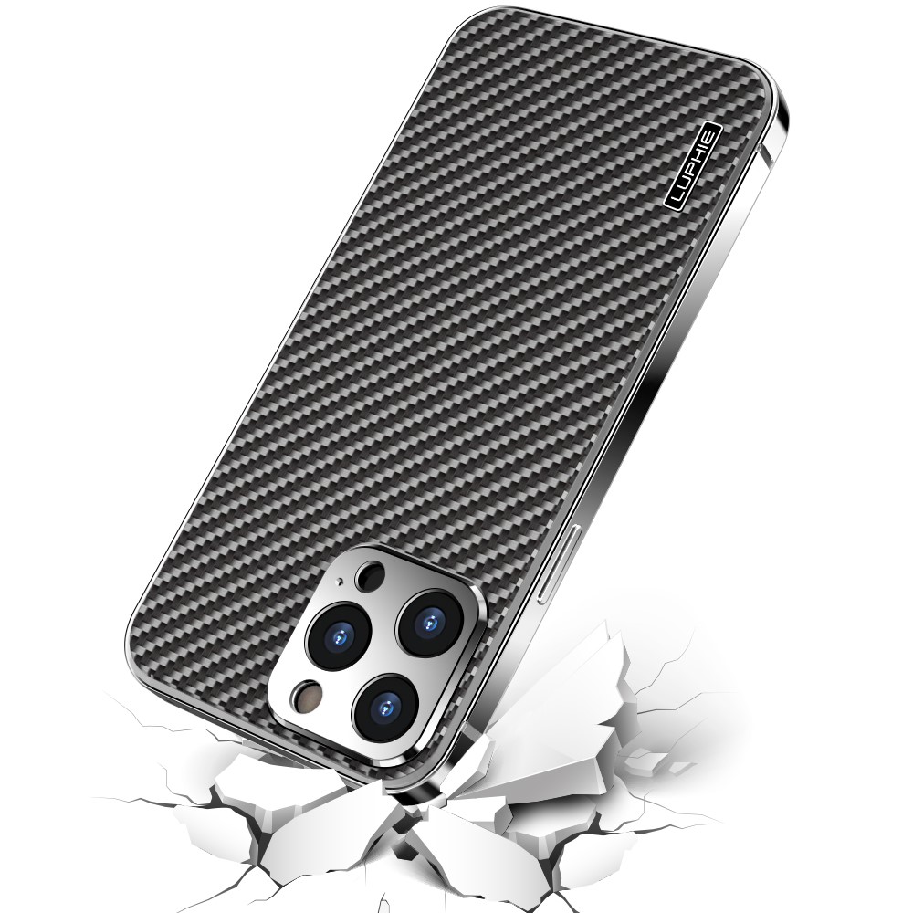 Θήκη iPhone 13 Pro Max LUPHIE μεταλλική με υφή από ανθρακόνημα (Carbon) με Camera Protection Raised lips πλάτη ασημί