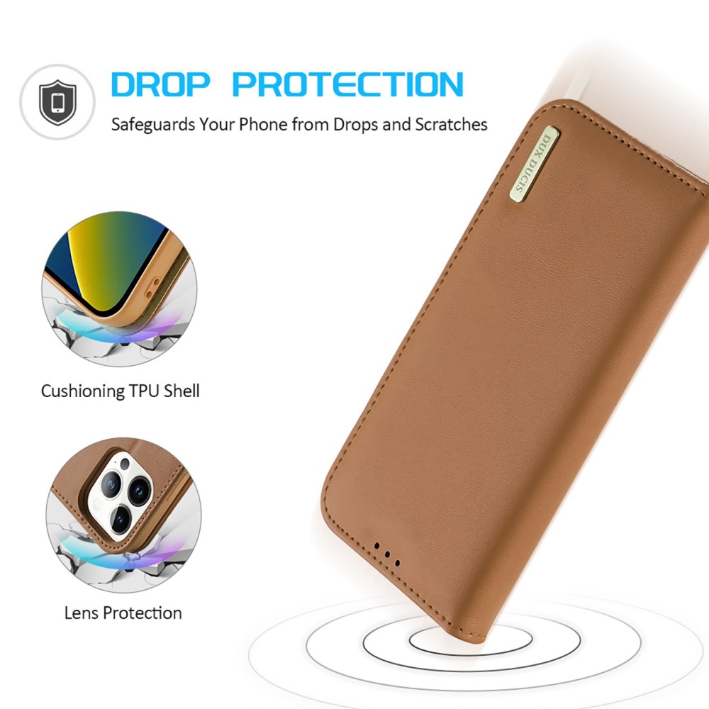Θήκη iPhone 14 Pro Dux Ducis Hivo Series με RFID Blocking, βάση στήριξης, υποδοχές καρτών με μαγνητικό κλείσιμο Flip Wallet από αυθεντικό δέρμα και TPU καφέ