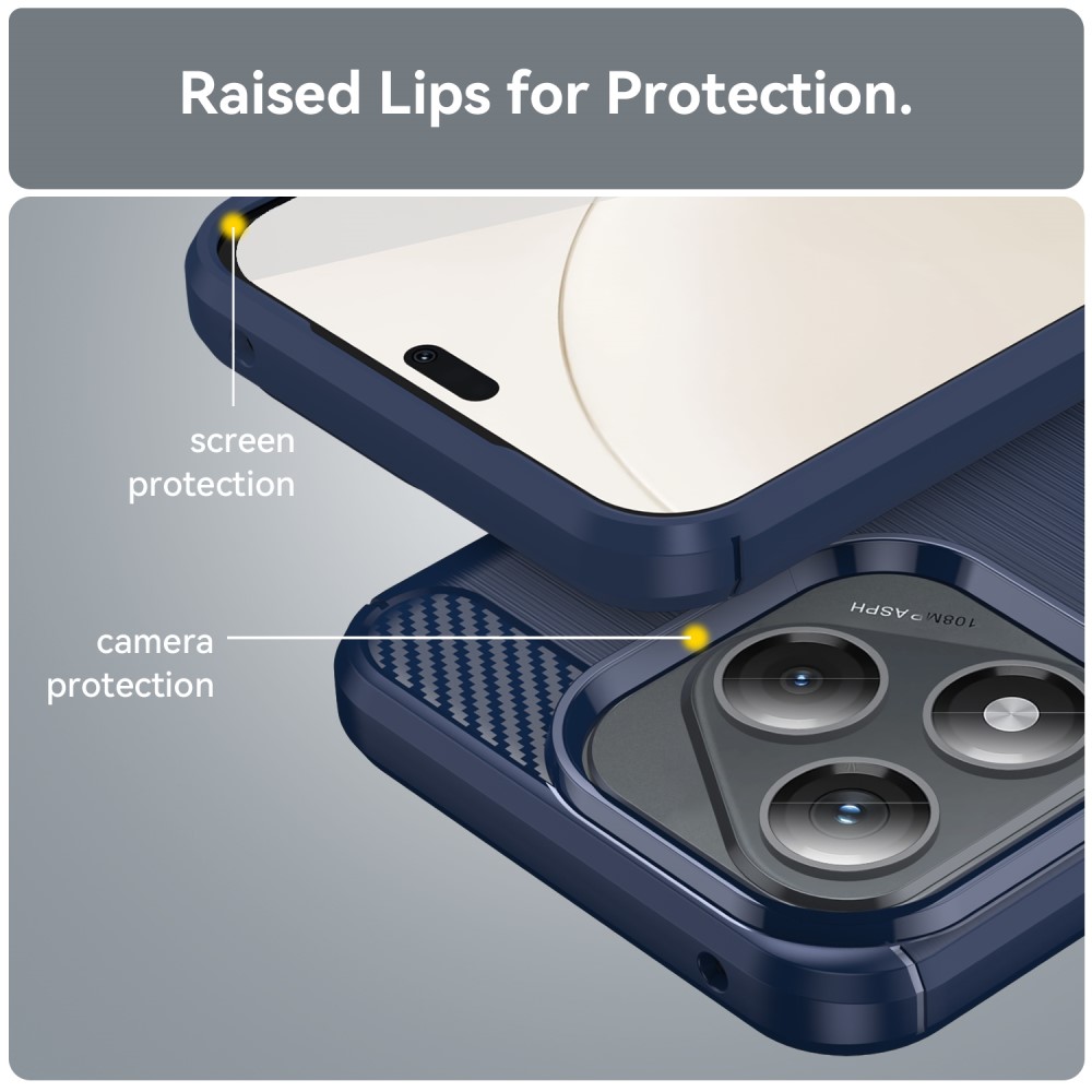 Η συγκεκριμένη θήκη σε μπλε χρώμα και σχέδιο Carbon fiber (ανθρακόνημα) για το Honor 400 Lite 5G στην πίσω όψη προσδίδει το μέγιστο σε ομορφιά / αισθητική της θήκης και σε κάνει να μην θέλεις να την αποχωριστείς. Επιπλέον είναι αντιολισθητική και δεν λερώνει εύκολα.