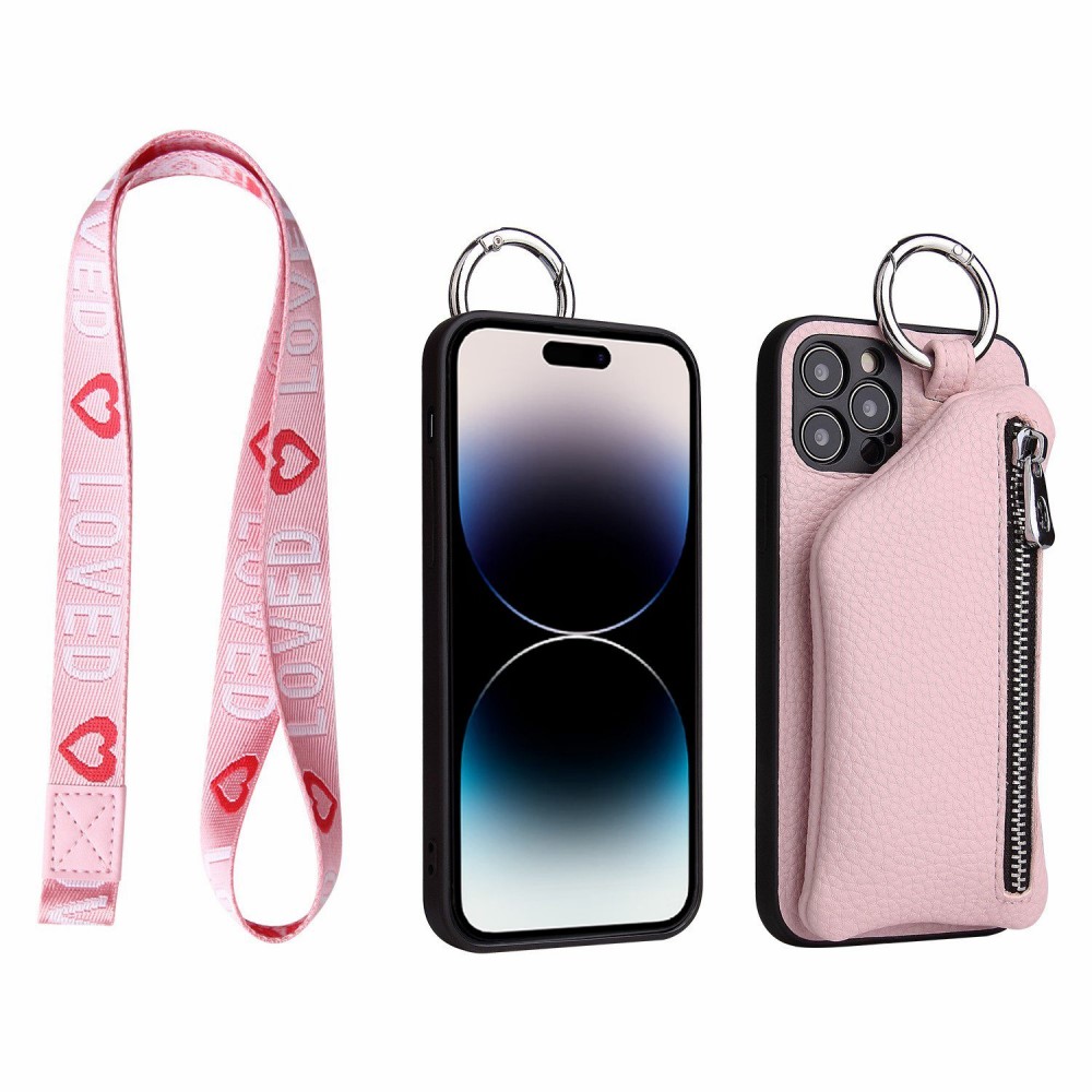 Θήκη iPhone 14 Pro Mad Mask πλάτη δερματίνης με κορδόνι και πορτοφόλι με φερμουαρ από αντικραδασμικό TPU ροζ