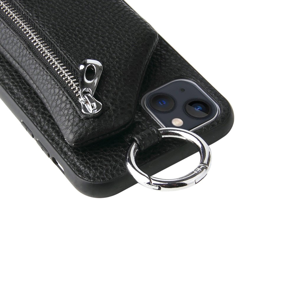 Θήκη iPhone 14 Mad Mask πλάτη δερματίνης με κορδόνι και πορτοφόλι με φερμουαρ από αντικραδασμικό TPU μαύρο
