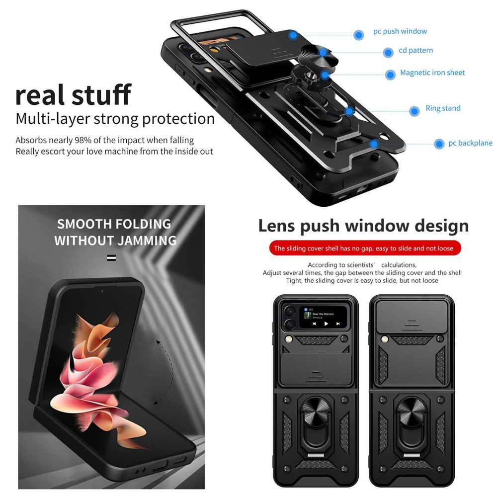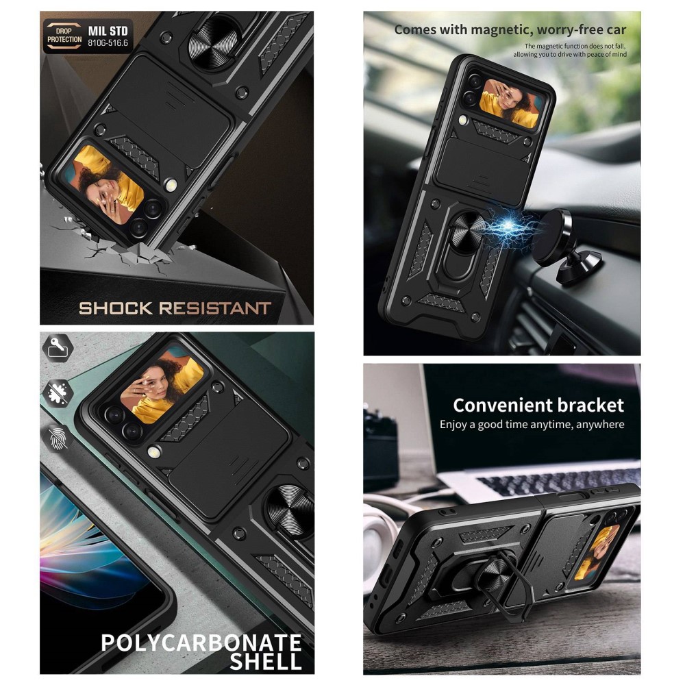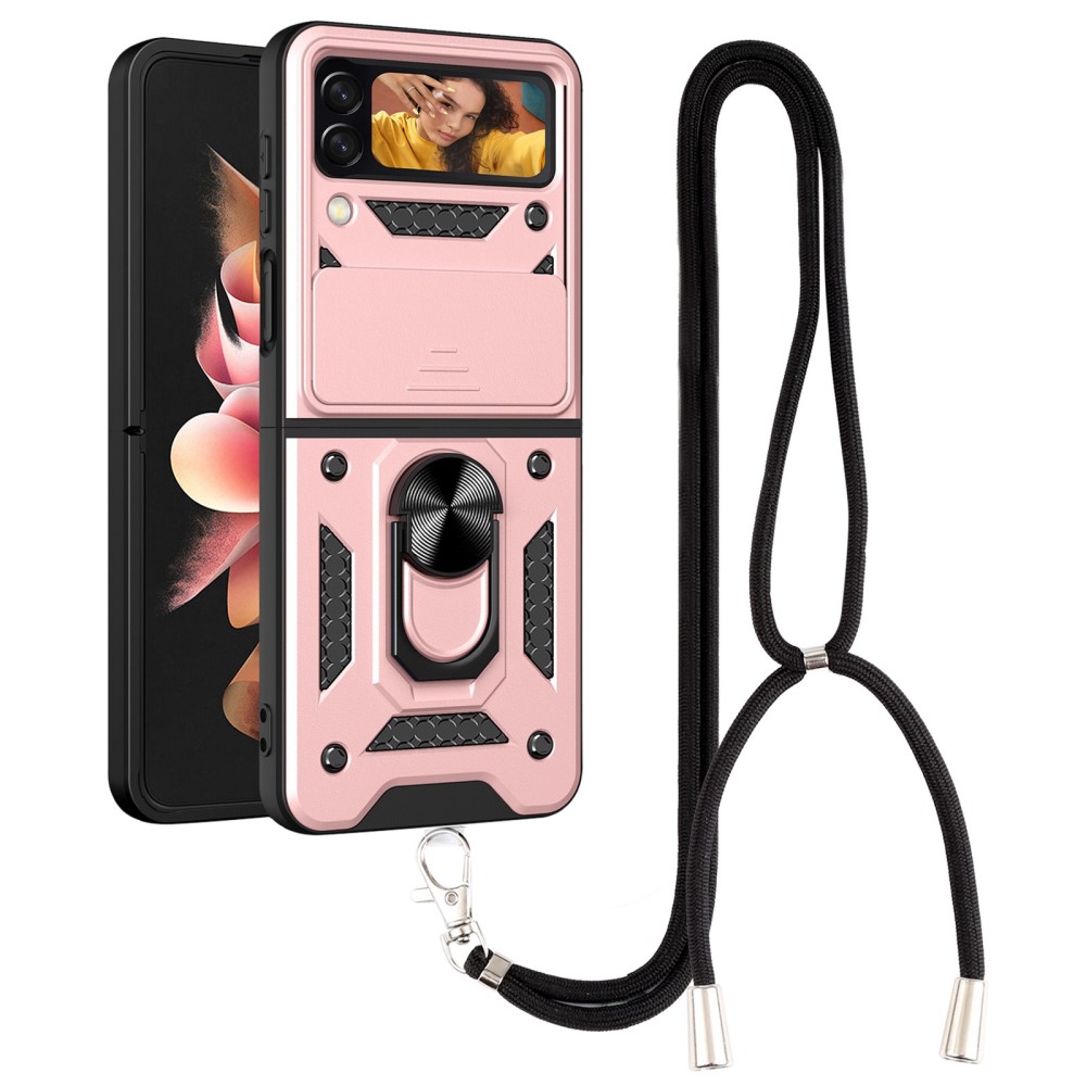Θήκη Samsung Galaxy Z Flip4 5G Mad Mask Camshield Armor Guard Πλάτη με προστασία για την κάμερα, Kickstand και κορδόνι για το λαιμό από σκλήρό Premium TPU ροζ χρυσό