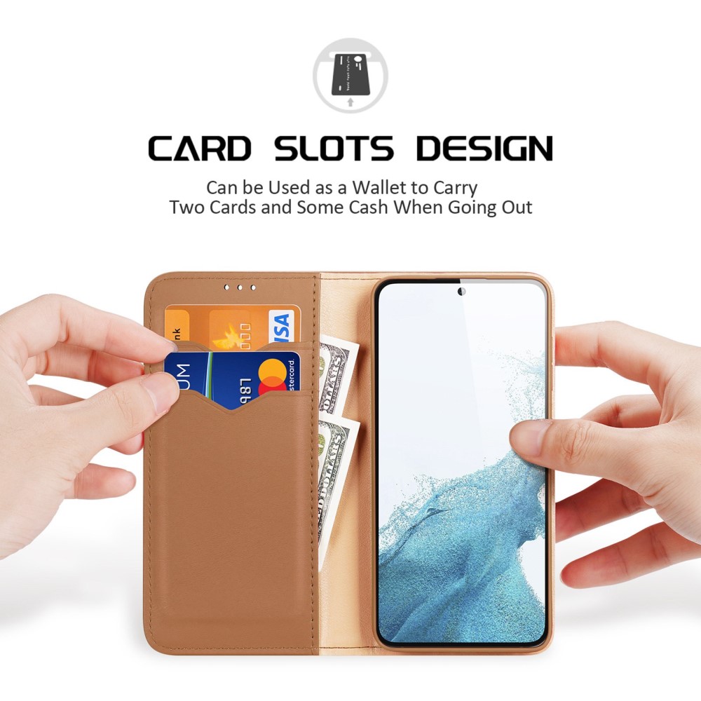 Θήκη Samsung Galaxy S23 Plus Dux Ducis Hivo Series: Πολυτελής προστασία με βάση στήριξης, RFID Blocking και υποδοχή για κάρτες σε καφέ χρώμα.