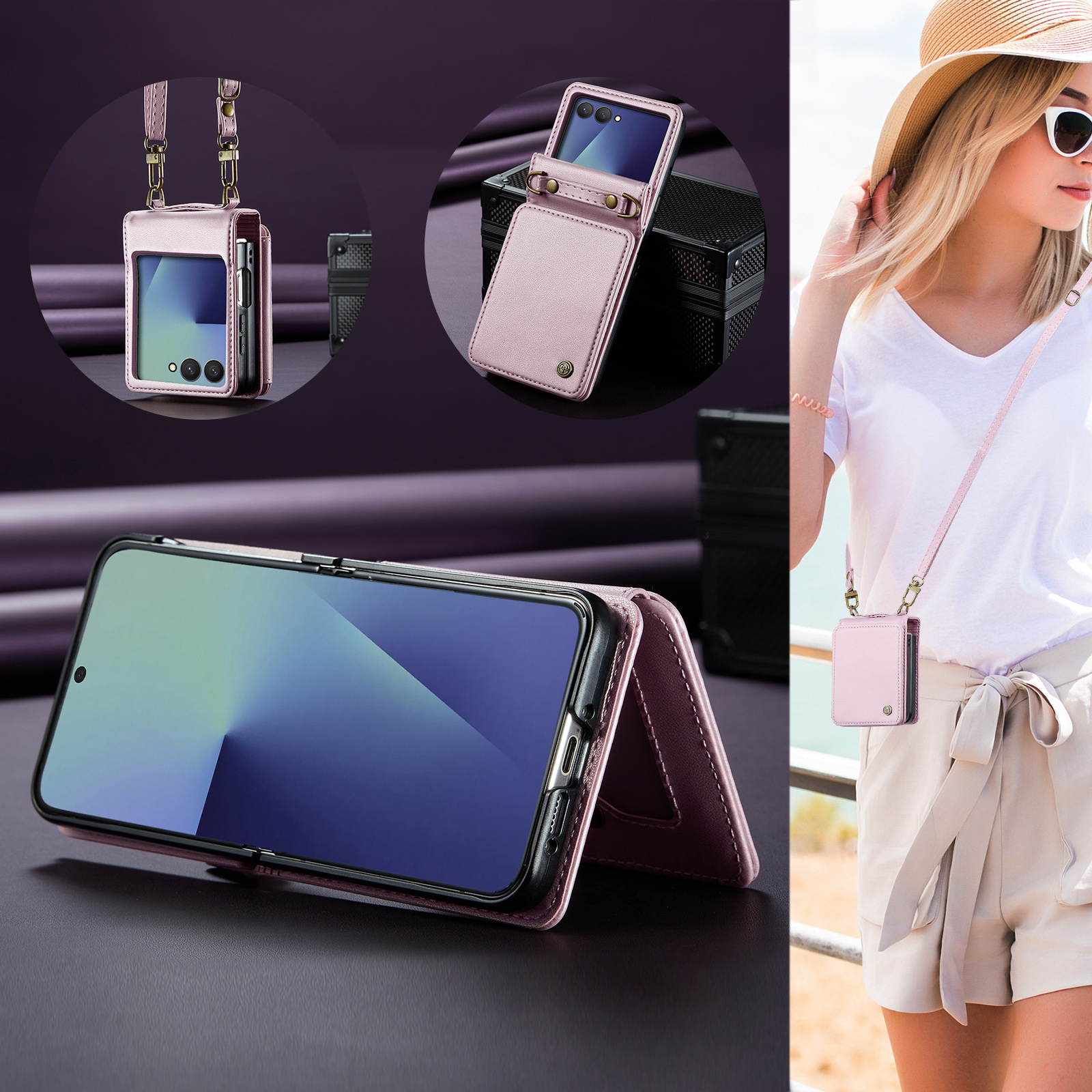 Θήκη Samsung Galaxy Z Flip7 5G CASEME C22 Series Πορτοφόλι με λουράκι, υποδοχές καρτών και μαγνητικό κούμπωμα από συνθετικό δέρμα και TPU ροζ