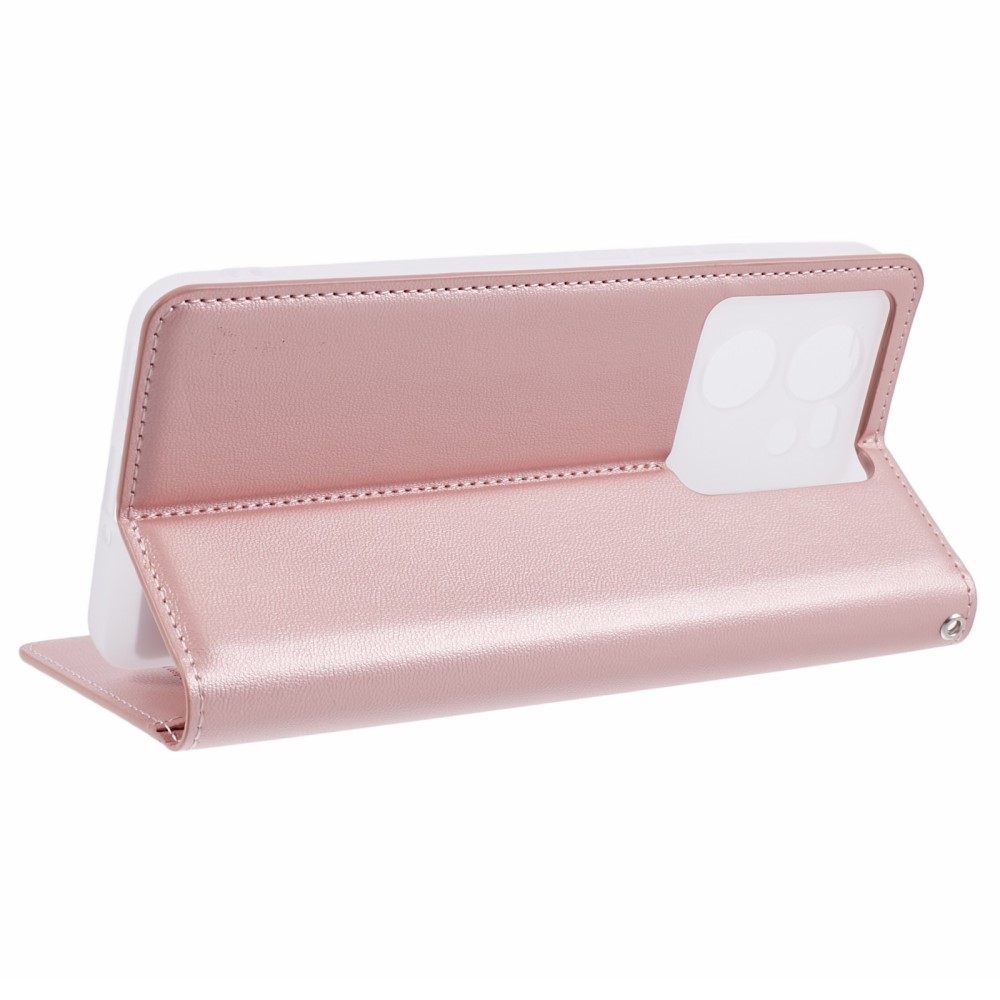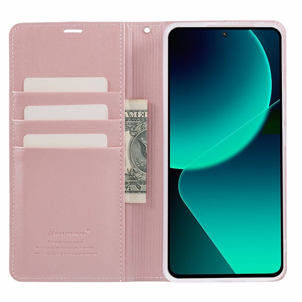 Θήκη Xiaomi 13T 5G / 13T Pro 5G HANMAN Minuo Series με βάση στήριξης, υποδοχή καρτών και μαγνητικό κούμπωμα Flip Wallet από συνθετικό δέρμα και εσωτερικό TPU ροζ χρυσό