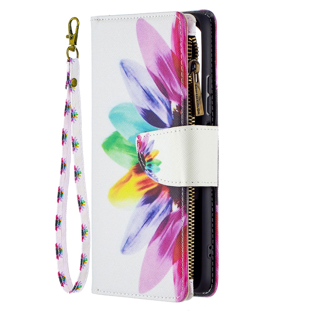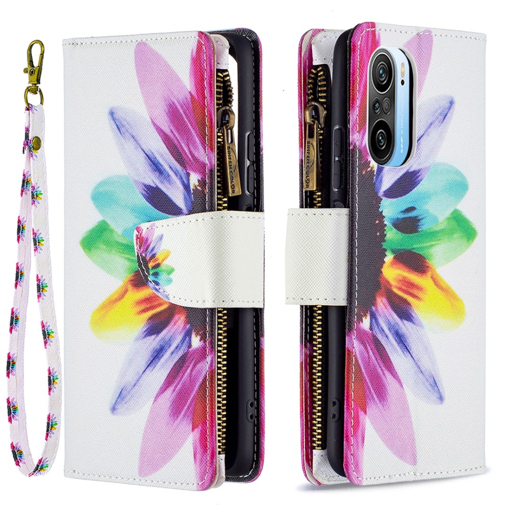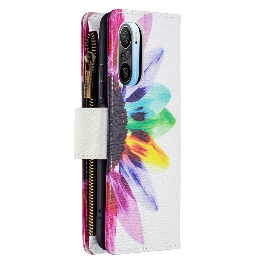 Θήκη Xiaomi Poco F3 / Mi 11i OEM Colorful Petals Πορτοφόλι με βάση στήριξης, υποδοχές καρτών με φερμουάρ και μαγνητικό κούμπωμα από συνθετικό δέρμα και TPU