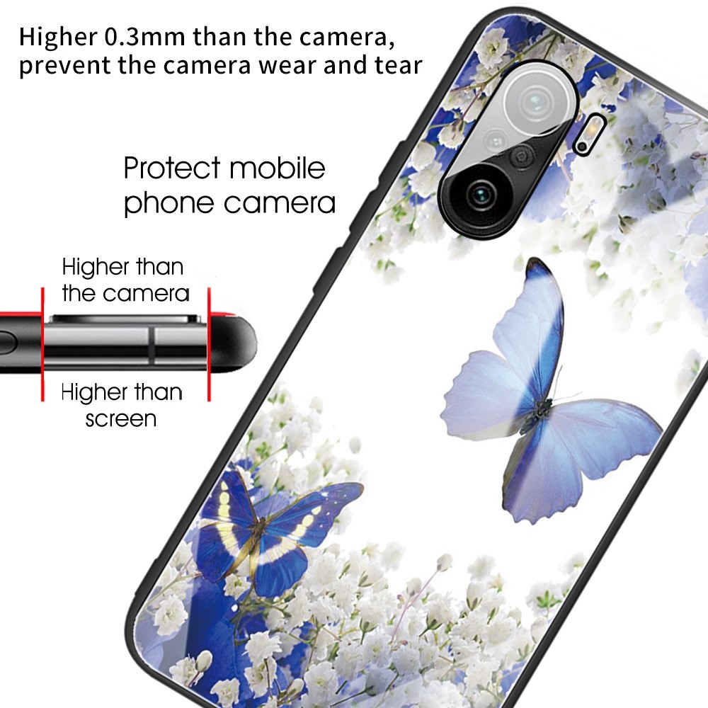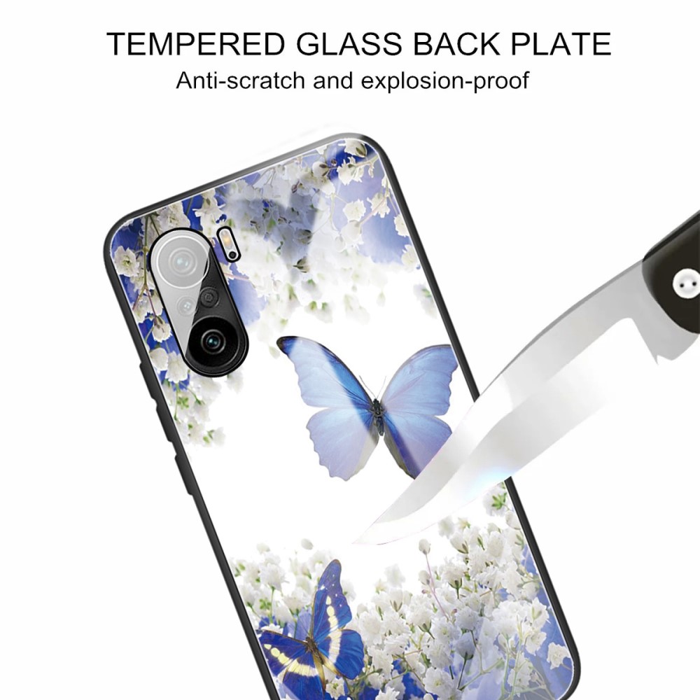 Θήκη Xiaomi Poco F3 / Mi 11i OEM σχέδιο Blue Butterfly με πλάτη από Tempered Glass και εσωτερικό TPU