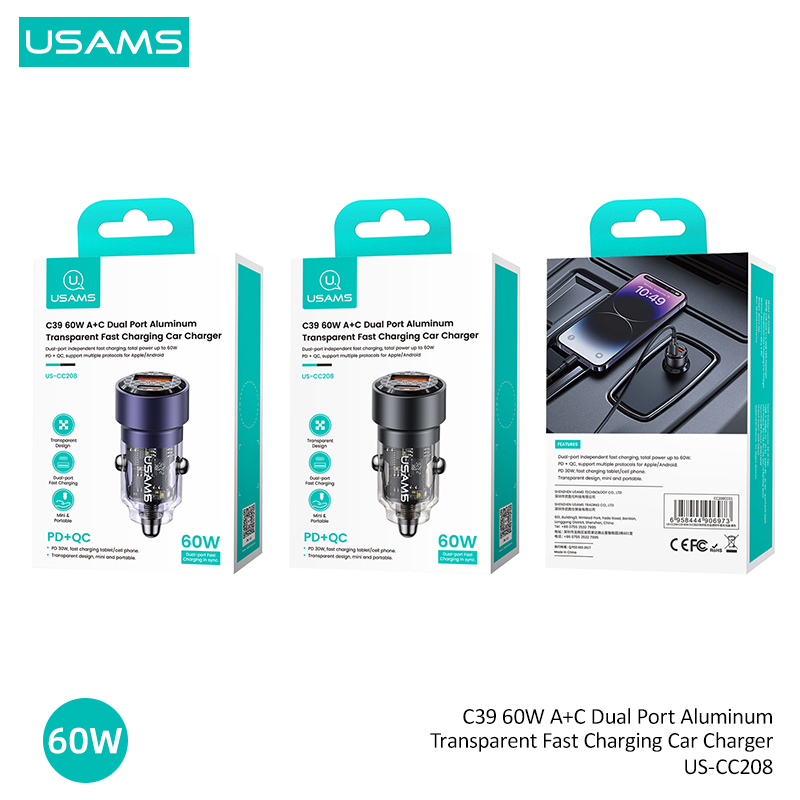 Ο φορτιστής αυτοκινήτου USAMS CC208 διαθέτει διπλές θύρες (USB-A & Type-C)για ανεξάρτητη γρήγορη φόρτιση, με συνολική ισχύ έως 60W. Υποστηρίζει τα πρωτόκολλα PD και QC, καθιστώντας τον συμβατό με πολλαπλά πρωτόκολλα για συσκευές Apple και Android. Παρέχει γρήγορη φόρτιση PD 30W για tablet και κινητά τηλέφωνα. Ο διαφανής σχεδιασμός του τον καθιστά μίνι και φορητό.