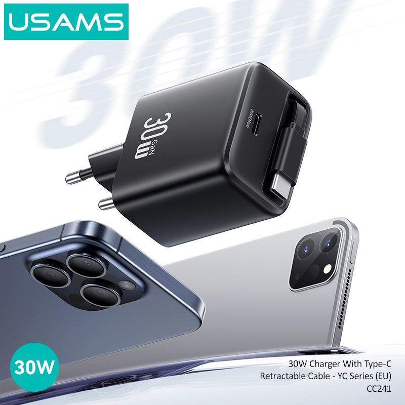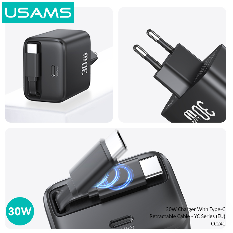 USAMS CC241 YC Series Επιτοίχιος Φορτιστής 30W GaN με Type-C Retractable καλώδιο 80cm και θύρα Type-C  λευκό