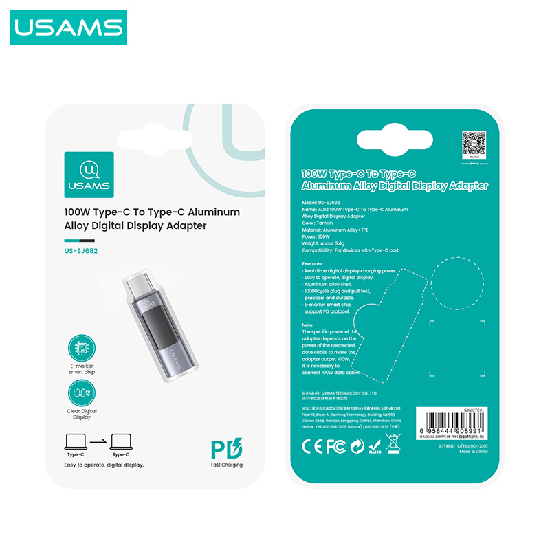 Ο αντάπτορας USAMS SJ682AU18 μετατρέπει από Type-C αρσενικό σε Type-C θηλυκό και διαθέτει ψηφιακή οθόνη. Παρέχει ισχύ έως και 100W, αλλά η συγκεκριμένη ισχύς εξαρτάται από το συνδεδεμένο καλώδιο δεδομένων, απαιτώντας καλώδιο δεδομένων 100W για να επιτευχθεί η μέγιστη ισχύς. Ενσωματώνει έξυπνο τσιπ E-marker που υποστηρίζει το πρωτόκολλο PD.